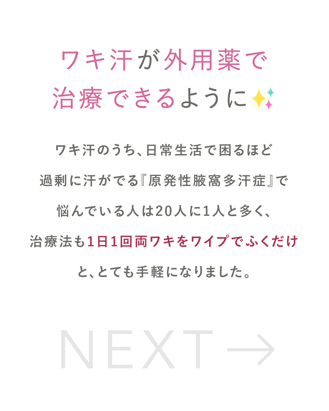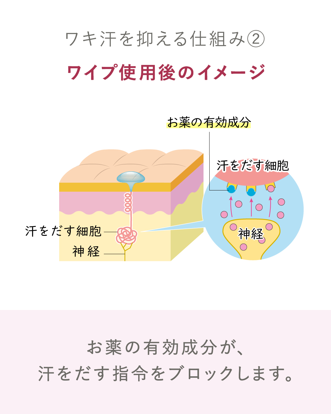 ました!スカーレットでも治療できるようになっております。専用のワイプで両脇をふくことで、お薬の有効成分がワキ汗の過剰な分泌を抑え、ワキ汗が原因のニオイや汗じみなども軽減できます。